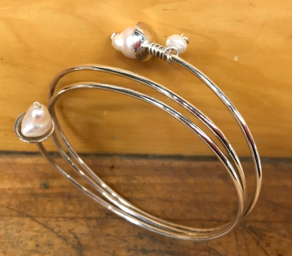 Wound round sterling silver wire bracelet with Pearl accents