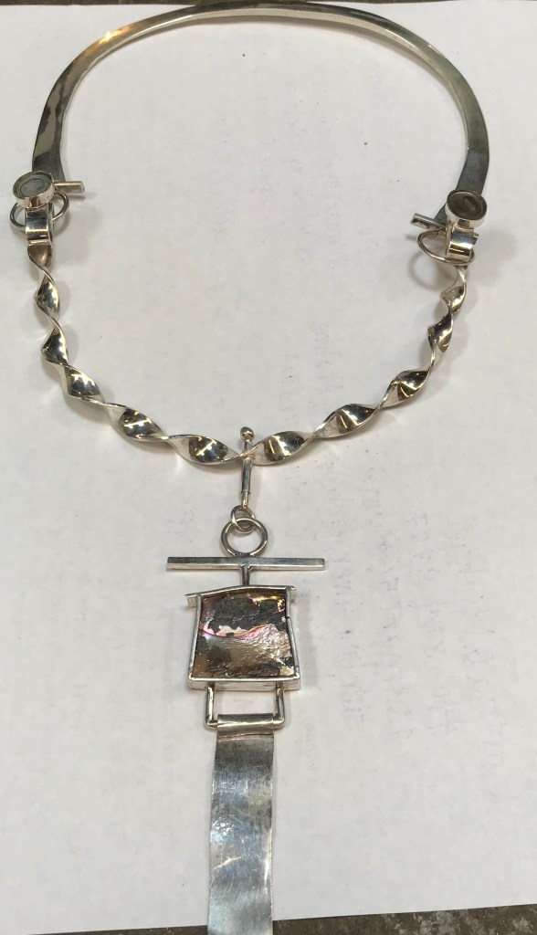 Sterling silver twisted neck piece with abalone accents at sides and one that can be turned with roll printed silver extension