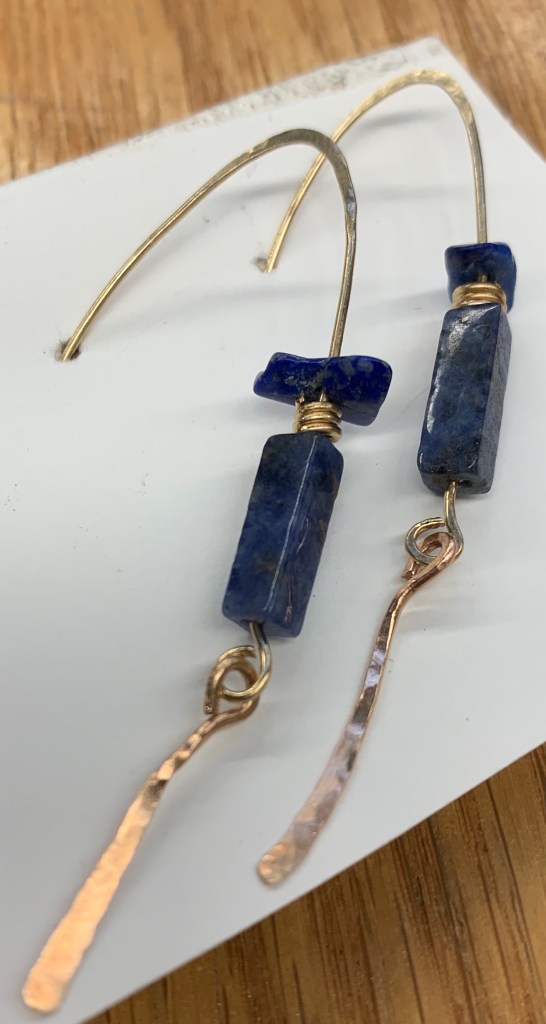 Hammered 14 kt red gold earrings with lapis accents